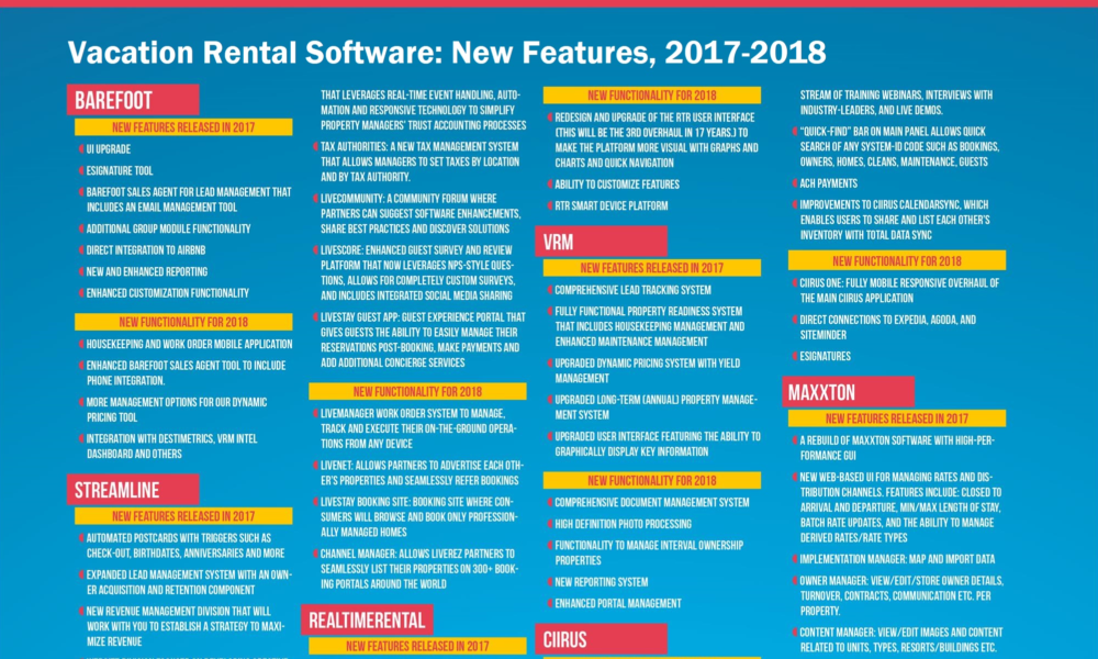 Executives at Barefoot, CiiRUS, LiveRez, Maxxton, RealTimeRental, Streamline, and Virtual Resort Manager (VRM) let us in on their recent developments and provided insight into what vacation rental managers can expect to see from the software industry in the coming year. We also asked these technology leaders about the future of all in one solutions vs. plug and play, and whether the industry can expect to see consolidation in the VR software sector.