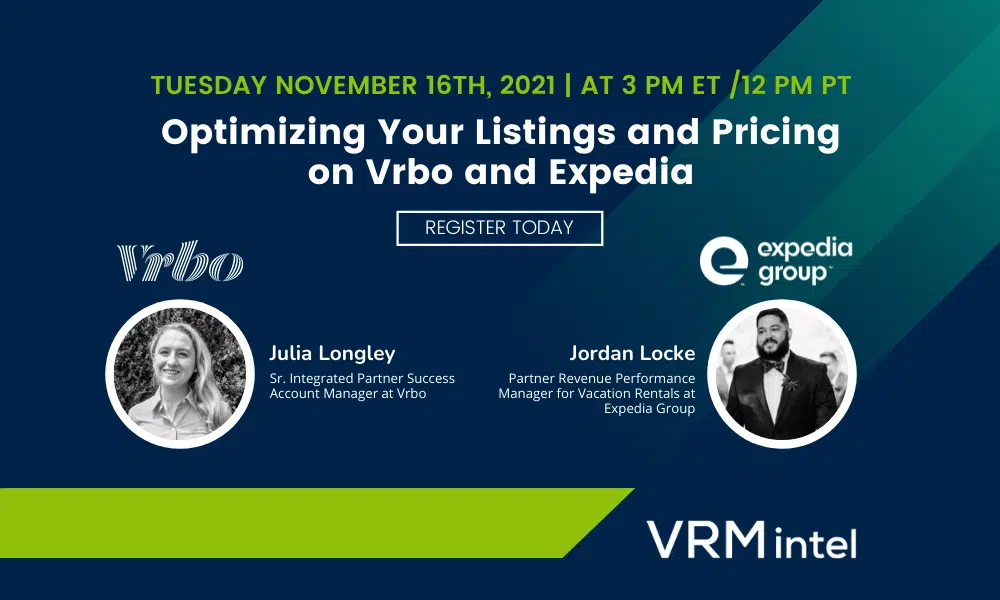 Join us for a free webinar for vacation rental professionals next Tuesday, November 16, 2021 at 3:00 pm ET/12:oo pm PT, and learn how to best optimize your listings and pricing on Vrbo and Expedia.